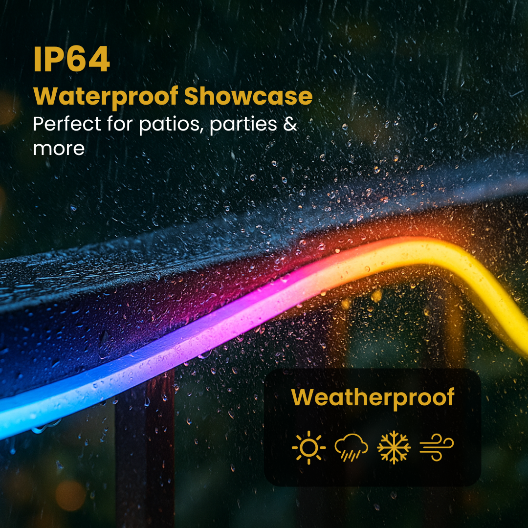 🌟 The Neon Flex LED Strip features premium 💡 5050-RGBIC LEDs encased in a 💎 high-transparency, IP67 waterproof silicone shell.✨ Supports segmented multi-color display, 📱 Bluetooth app control with 🔆 dimming & ⏰ timers, and 🎶 music sync via a built-in 🎤 microphone.