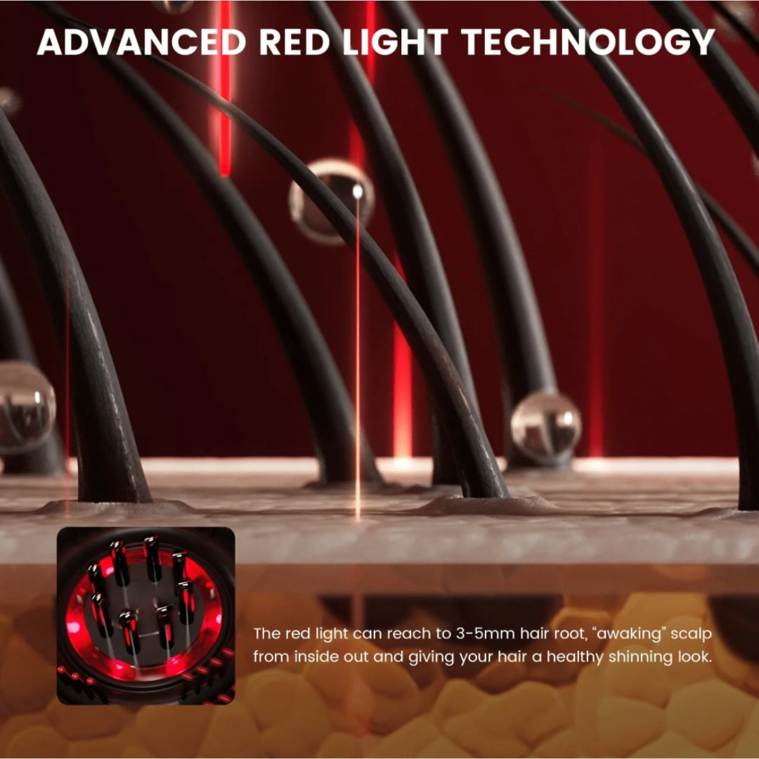 • 🔴 Red Light Therapy: 850nm infrared wavelengths penetrate 3–5 cm to awaken the scalp, promote hair growth, and improve scalp health at the root.